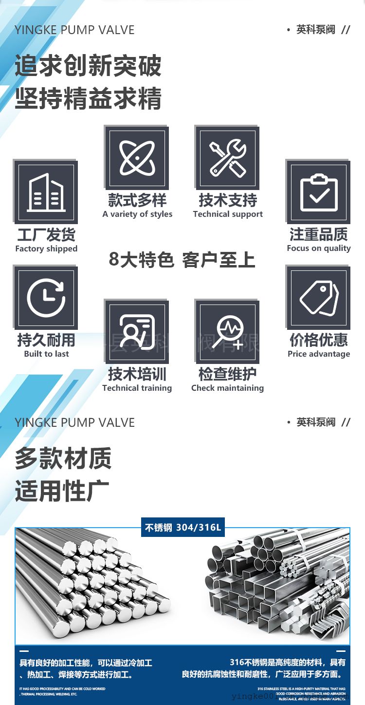 Yingke is committed to automation research and development. Yingke Company is a modern high-tech enterprise integrating scientific research, design, manufacturing, sales and service. YK electric actuator has the characteristics of compact structure, exquisite appearance, intelligent control, excellent performance, excellent quality, and easy use;YK pneumatic device is mainly composed of cylinder, piston, gear shaft, end cover, seals, screws, etc.; the complete set of pneumatic devices should also include opening indication, travel limit, solenoid valve, positioner, pneumatic components, manual mechanism, signal feedback and other components. Yongjia County Yingke Pump Valve Co., Ltd. specializes in producing pneumatic butterfly valves, electric butterfly valves, pneumatic ball valves, pneumatic actuators, electric actuators, pneumatic three-way ball valves, electric three-way ball valves, pneumatic two-piece ball valves, electric three-piece ball valves, electromagnetic valves, pneumatic diaphragm pumps, electric diaphragm pumps, sanitary grade electric diaphragm pumps, stainless steel diaphragm pumps, aluminum alloy pneumatic diaphragm pumps, manual diaphragm pumps, fluorine-lined pneumatic diaphragm pumps, diaphragm metering pumps, Plunger metering pumps, metering dosing pumps and other automatic control products. Yingke will learn technology and provide high-quality services; emphasize efficiency and satisfy users with actions; expand publicity and open up new market situations; establish systems and establish a new corporate image; and strive to become a booster and trustworthy partner for our customers to take off their careers.- Name(chinese)