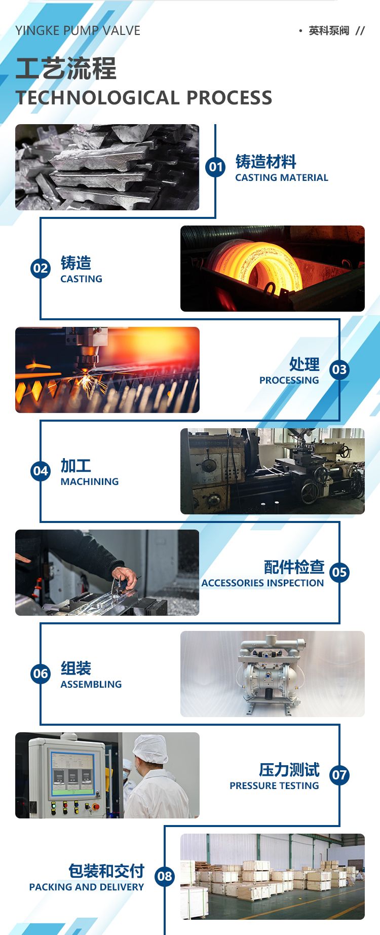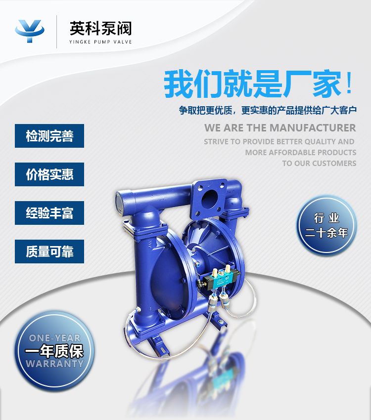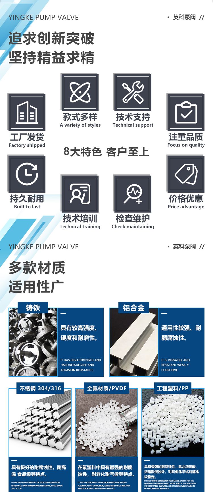 Yingke is committed to automation research and development. Yingke Company is a modern high-tech enterprise integrating scientific research, design, manufacturing, sales and service. YK electric actuator has the characteristics of compact structure, exquisite appearance, intelligent control, excellent performance, excellent quality, and easy use;YK pneumatic device is mainly composed of cylinder, piston, gear shaft, end cover, seals, screws, etc.; the complete set of pneumatic devices should also include opening indication, travel limit, solenoid valve, positioner, pneumatic components, manual mechanism, signal feedback and other components. Yongjia County Yingke Pump Valve Co., Ltd. specializes in producing pneumatic butterfly valves, electric butterfly valves, pneumatic ball valves, pneumatic actuators, electric actuators, pneumatic three-way ball valves, electric three-way ball valves, pneumatic two-piece ball valves, electric three-piece ball valves, electromagnetic valves, pneumatic diaphragm pumps, electric diaphragm pumps, sanitary grade electric diaphragm pumps, stainless steel diaphragm pumps, aluminum alloy pneumatic diaphragm pumps, manual diaphragm pumps, fluorine-lined pneumatic diaphragm pumps, diaphragm metering pumps, Plunger metering pumps, metering dosing pumps and other automatic control products. Yingke will learn technology and provide high-quality services; emphasize efficiency and satisfy users with actions; expand publicity and open up new market situations; establish systems and establish a new corporate image; and strive to become a booster and trustworthy partner for our customers to take off their careers.- Name(chinese)